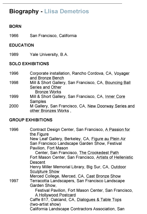 Biography - Llisa Demetrios page 2 Download Complete Biography for printing (pdf file) Home | Store | Help ©Copyright Artists Forum, 2004
